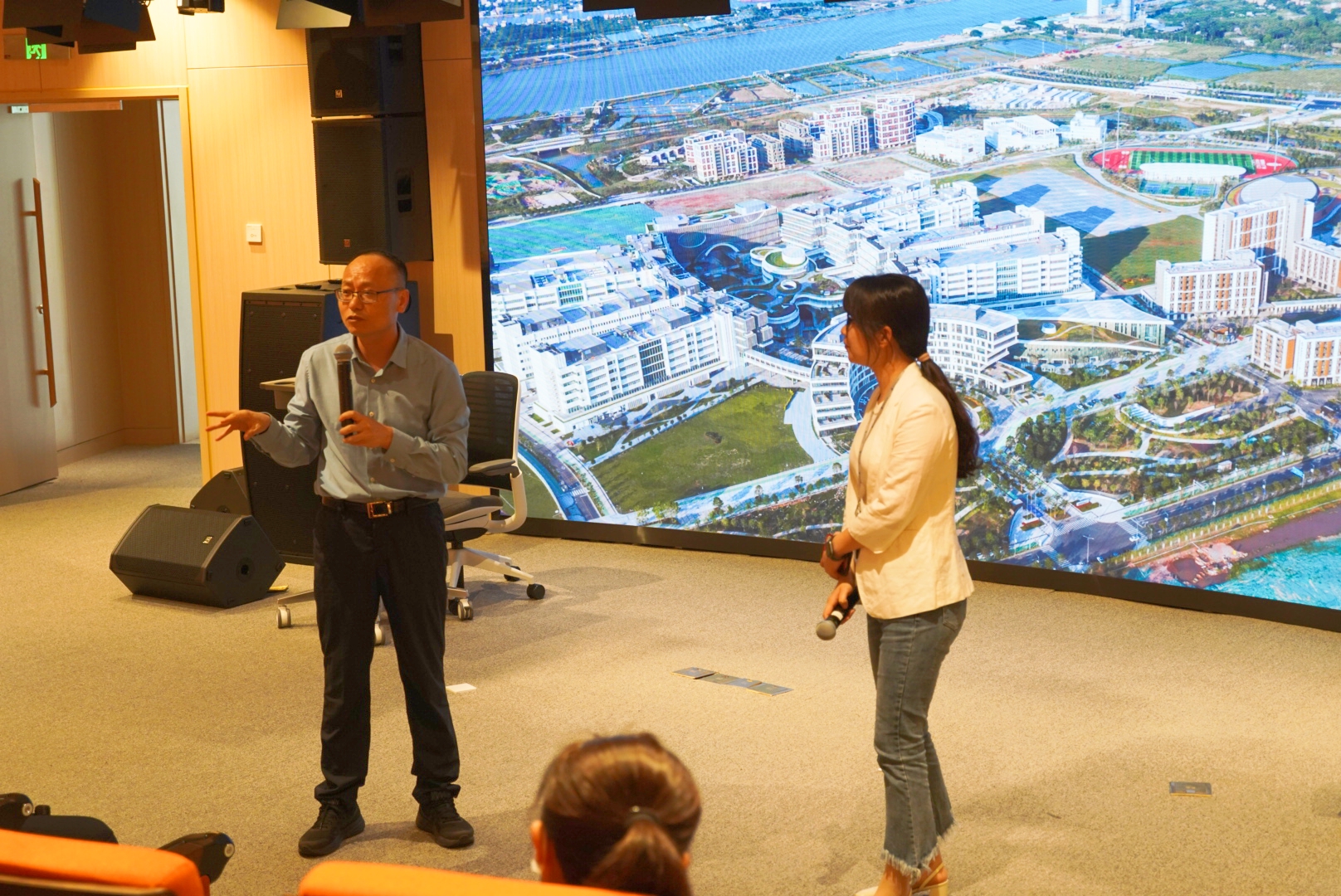 教师的到访给予了热情接待和周到安排。梁书记详细介绍了的校园总体布局、建设历程和发展规划。香港科技大学(广州)作为全球第一所真正意义上的学科融合大学,采用“枢纽”和“学域”的概念,取代了传统的院系办学框架,帮助学生成为复合型的创新型人才。作为一所国际化的一流大学,香港科技大学(广州)积极对接国家重大发展战略和需求,今年也将迎来第一批本科生。