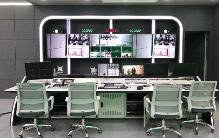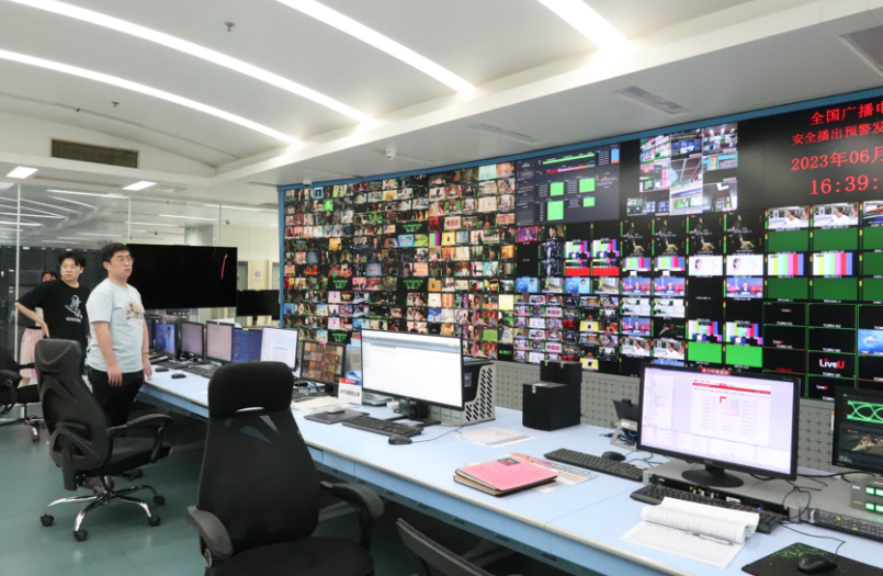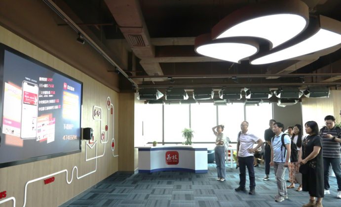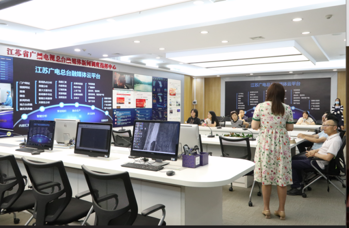 调研团队在江苏省广播电视总台高级编辑李钢和总台组织人事部副主任芦君的陪同带领下,先后前往幸福蓝海国际影城、总台融媒体新闻调度指挥中心、新闻演播厅、总控机房、节目研发与用户研究中心、受众测试实验室、融媒体多功能访谈区参观,了解江苏广电总台在融媒体平台建设和媒体融合体制机制改革创新的相关举措与成果。