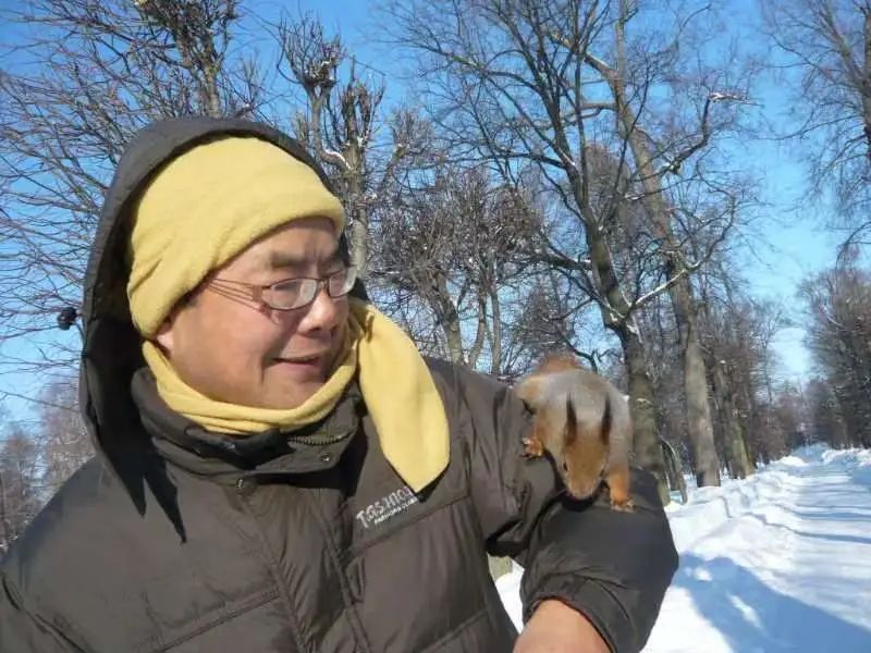 夏老师最终选择在广州大学的前身——广州师范学院担任教师,广州大学也给予了他想要的自由。在任教的二十余年中,夏老师除了完成日常教学工作以外,曾到过北京、美国、日本等地方访学,也曾与学院的同事一起去旅游,“我们曾一起去过俄罗斯,这张是我抓拍的照片,一只小松鼠在夏老师的肩上。”回忆起与夏老师相处的时光,新闻学系李近老师侃侃而谈,语气中透露着不舍。