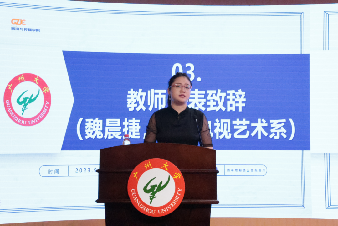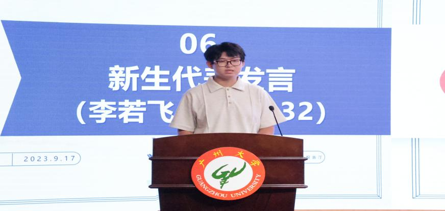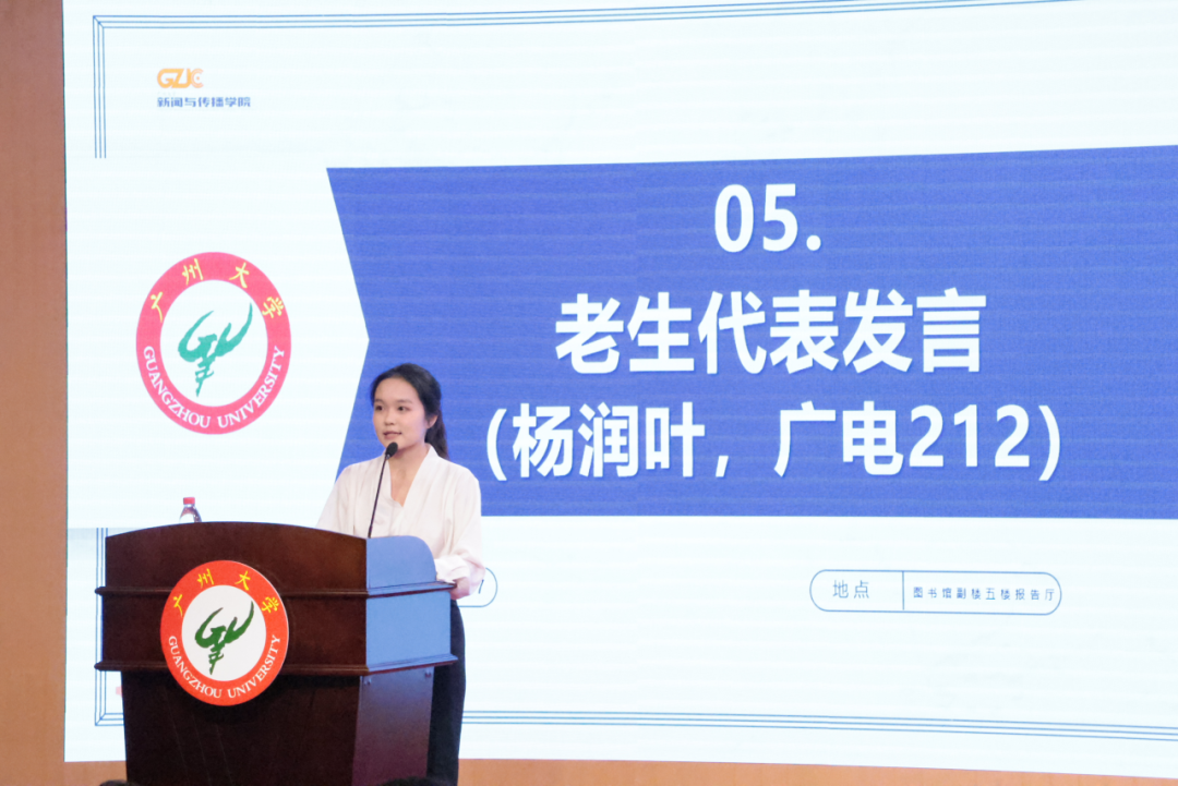 典礼的最后,是学生代表发言环节。广电212班的杨润叶作为老生代表上台与大家分享了自己在广大丰富多彩的校园生活。她提到自己通过广州大学这个广阔平台,取得了许多成绩,也收获了一个更加优秀的自己。因此,她也鼓励学弟学妹们能够勇于尝试,积极探索,不断试错,学会与“失败者”的身份和睦相处,并在这个过程中达到自洽。