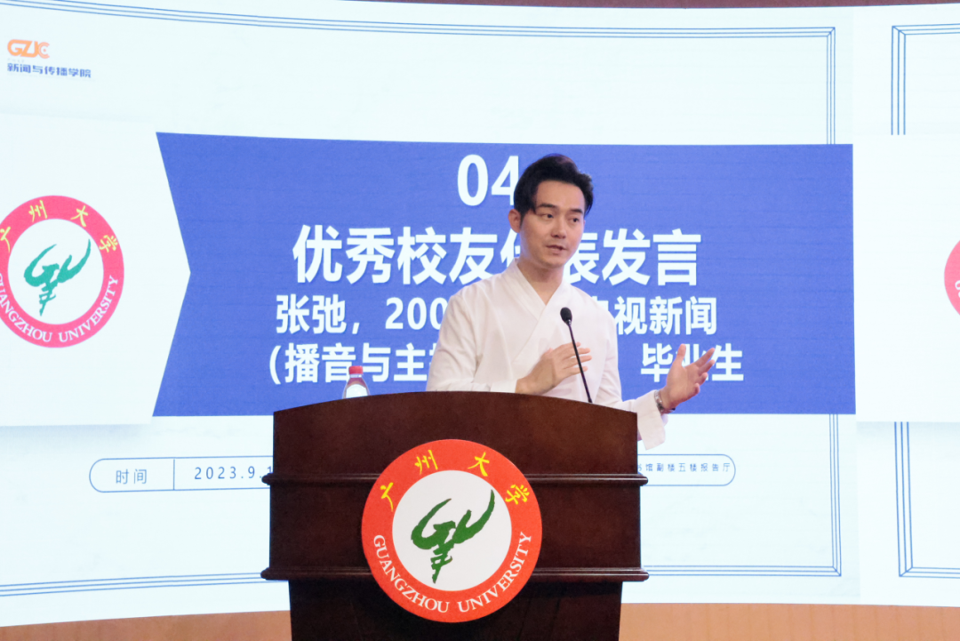 之后,优秀校友代表张弛分享了自己自广大新传求学以来的亲身经历:做最好的主持人是就读广大后确立的第一个目标;毕业后前往马来西亚的电视台工作,之后又进广东电视台做主播;为历练自我做过记者,当大学老师培养语言表达人才;现在坚持做自己的视频号栏目——《张弛有道·粤语读诗》,创立相关公司专门推广粤语文化。