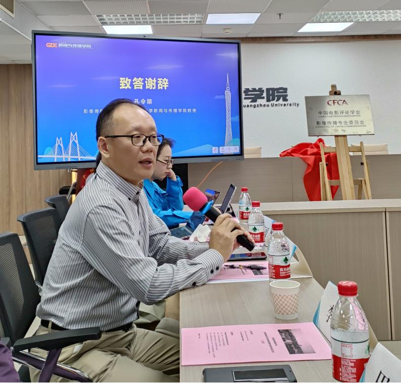 教授、影像传播专业委员会主任孔令顺致答谢词。孔令顺教授首先感谢了中国电影评论学会的信任,表示团队将不辱使命,力争把影像传播专业委员会建设得更好;其次感谢了学校的支持,希望专委会能为广州大学高水平大学建设添砖加瓦;最后感谢了学院的支持,希望在院领导的加盟和指导下,影像传播专委会将进一步整合学院内外部力量和资源,团结协作发出广大声音。