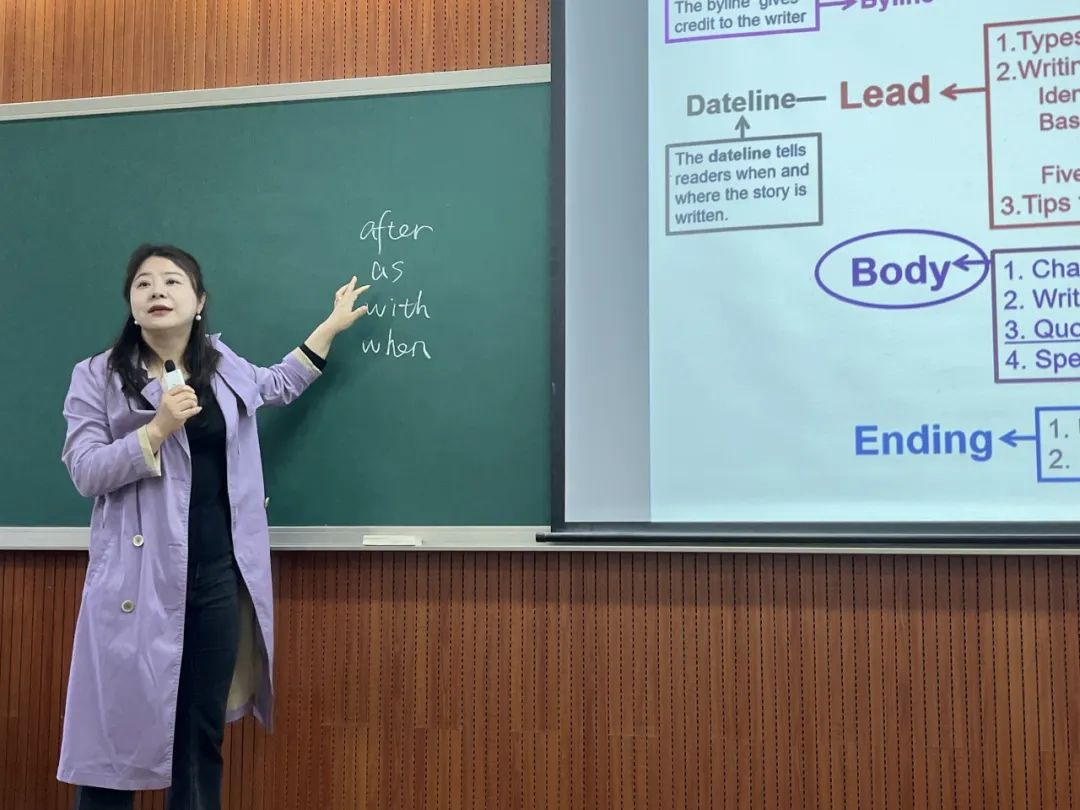 第一节课是赵丽君老师的《英语新闻写作》课程。本次课程的主题是“如何让通讯稿的正文部分更加客观真实”。赵丽君老师通过对比大量正反案例、写板书规范引语标点等,从如何撰写引用语、插入语以及如何穿插背景材料三个方面仔细讲授了本讲内容。