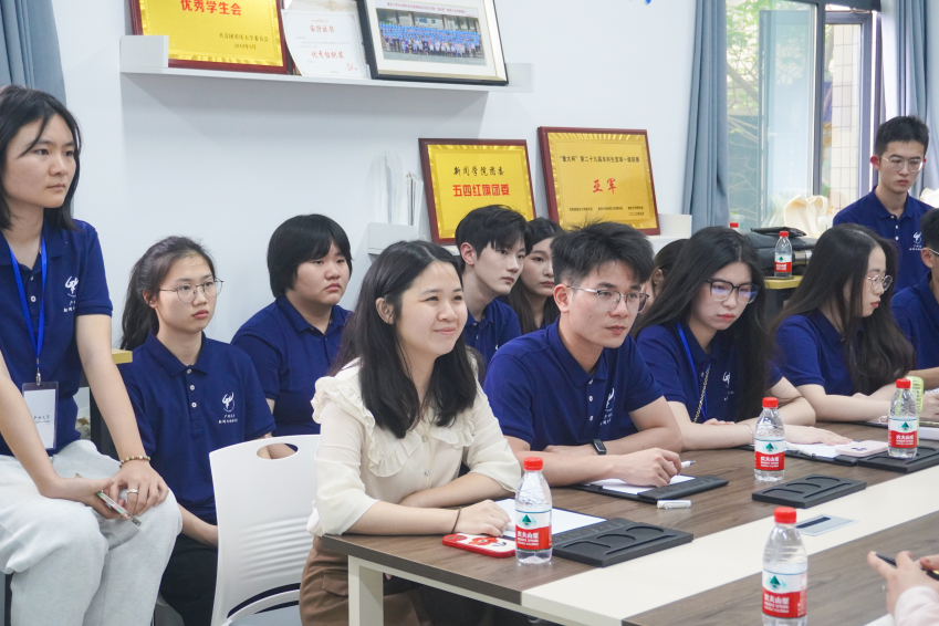 此后,双方师生就共同关心的问题进行了探讨和交流,分享团学工作和学生日常管理工作的经验与心得。重庆大学新闻学院的兼职辅导员、2022级新闻与传播专业研究生吴昆同学向大家分享了自己担任兼职辅导员的工作心得,也分享了自己如何在做好学生工作的同时兼顾专业学习。访学团学生干部对吴昆同学踏实负责、一丝不苟的工作态度感到由衷敬佩,从他身上学习了如何强化责任担当意识,合理安排时间,加强团队协作与沟通,注重自我提升。