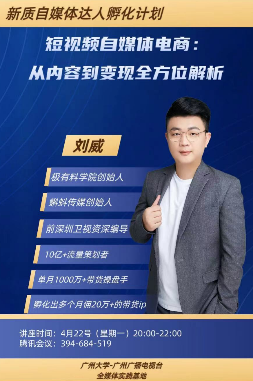 本次讲座的主讲嘉宾是广州大学毕业生、极有料学院创始人、蝌蚪传媒创始人刘威。刘威拥有丰富的自媒体运营经验,曾是深圳卫视资深编导,10亿+流量策划者,单月1000万+带货操盘手,成功孵化出多个月佣20万+的带货IP。