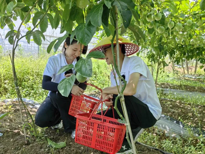 7月17日早上,实践团前往黄沙村百香果种植园。工作人员向大家介绍了关于百香果的基本知识,并指导实践团成员亲自上手体验采摘成熟的百香果。成员们了解到,黄沙村大范围种植百香果并非偶然,除耐储存,它还能带来较高的经济效益。据工作人员介绍,百香果不需要太高的冷链成本,对经济贡献很高,所以当地种得很多。