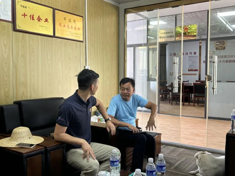 7月16日上午,在企业负责人李展辉的带领下,实践团前往参观 366 农业发展有限公司。李展辉向实践团介绍了公司发展历程、公司产品,并对如何结合现代化农业打造新型产品这一问题提出了自己的看法。“一核一带一区,我们在一核,产业社区服务核心区嘛”,李展辉说。在黄沙村布局下,“一核”将辐射富民示范带,实现产业兴旺,联农带农。
